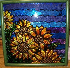 Картина в технике витраж, размер 25 на 25. Красивые, яркие подсолнухи на фоне вечернего неба.