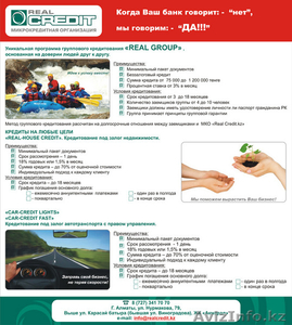 Хотите новую машину! МКО Real Credit выдает кредиты на приобретение автомобиля (на заказ, с автосалона и т.д.) Беззалоговые и залоговые кредиты. Низкие проценты! Выдаем кредиты без подтверждения дохода. Наш офис находится в городе Алматы - ул. Нурмакова 79 уг. ул. Карасай батыра ...